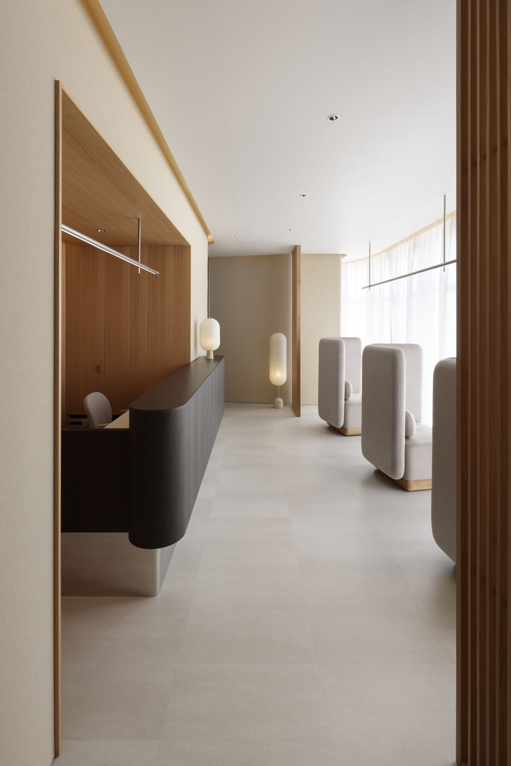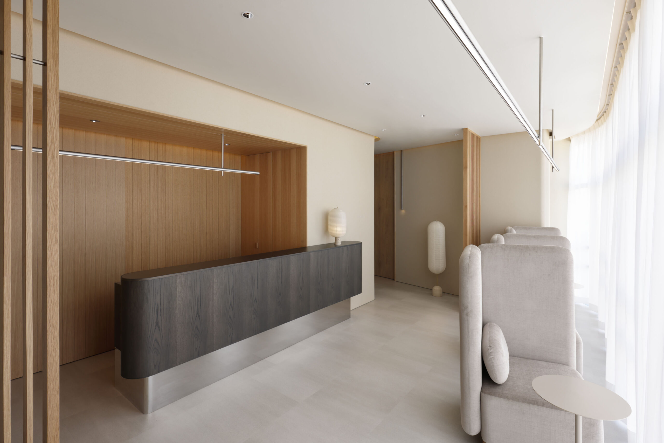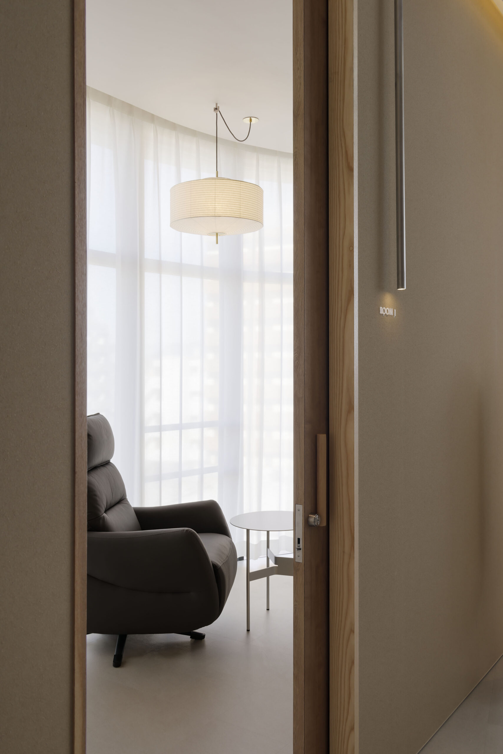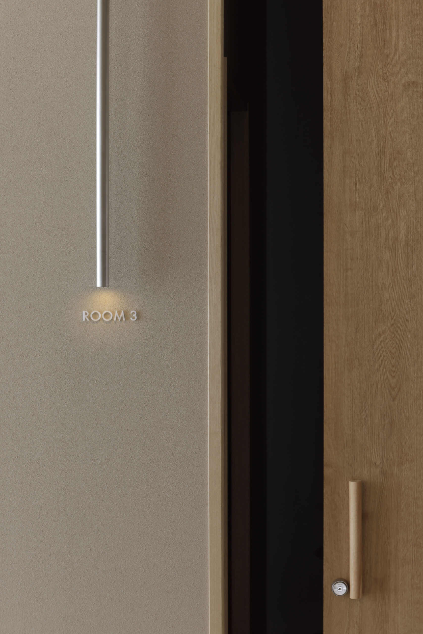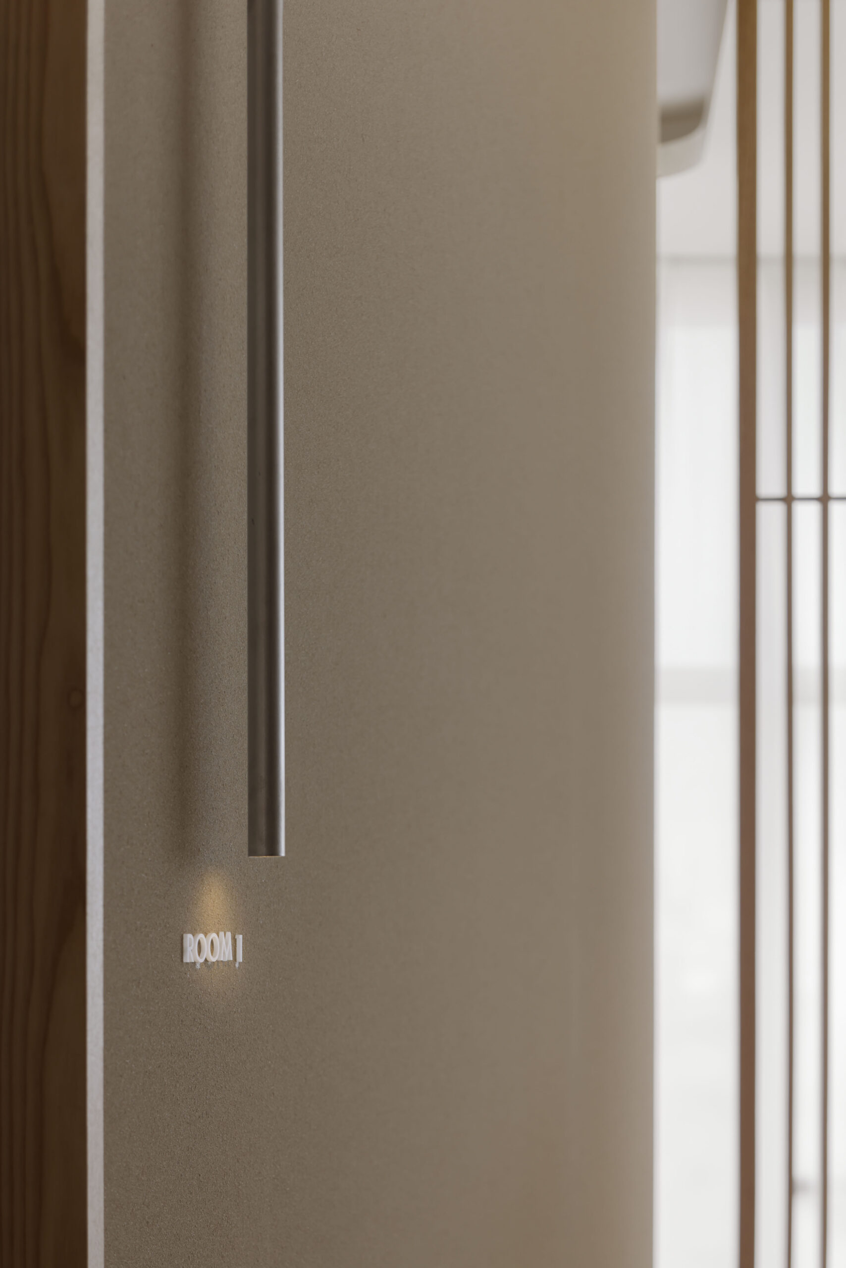 3年前に開院された内科内視鏡クリニックの増床PJ。既存クリニックの上層フロアに位置し待合と個室を主としたフロアとなるため医療施設という事を感じさせない特別感のある空間と、今後の更なる増床を見据えたゾーニング計画が求めらた。造作や照明器具・ソファなど各所に丸みを持たせたやわらかな空気感の中に外光が気持ちよく差し込むホテルライクな空間を目指しました。各所に散りばめたオリジナルのPIPE意匠は待合いスペースでは和を感じさせるディティールに照明機能を持たせ、PIPE先端から光がこぼれるルームサイン照明は内視鏡からイメージしシンプルでやわらかな空間に直線的かつ工業的な素材感を落とし込むことでほど良い緊張感を加えています。また来院される方々に末長く健康に過ごしてもらえる様にと思いを込めて樹齢100年を越える杉の無垢材から削り出された北田氏の作品を空間に添えています。