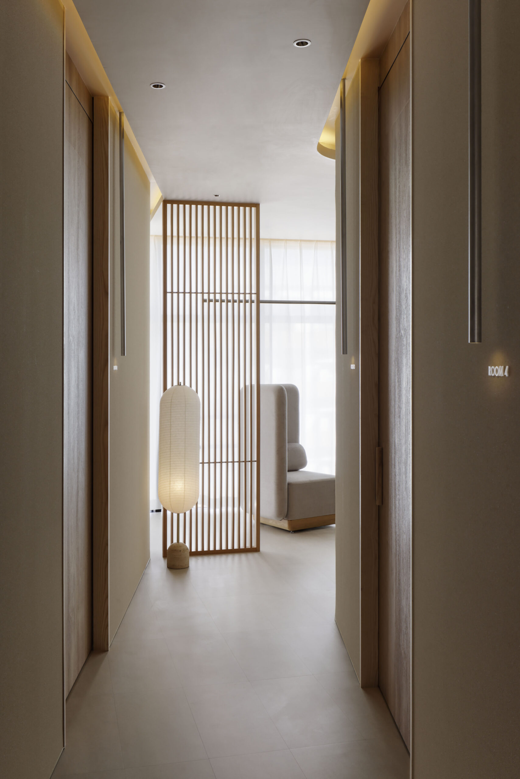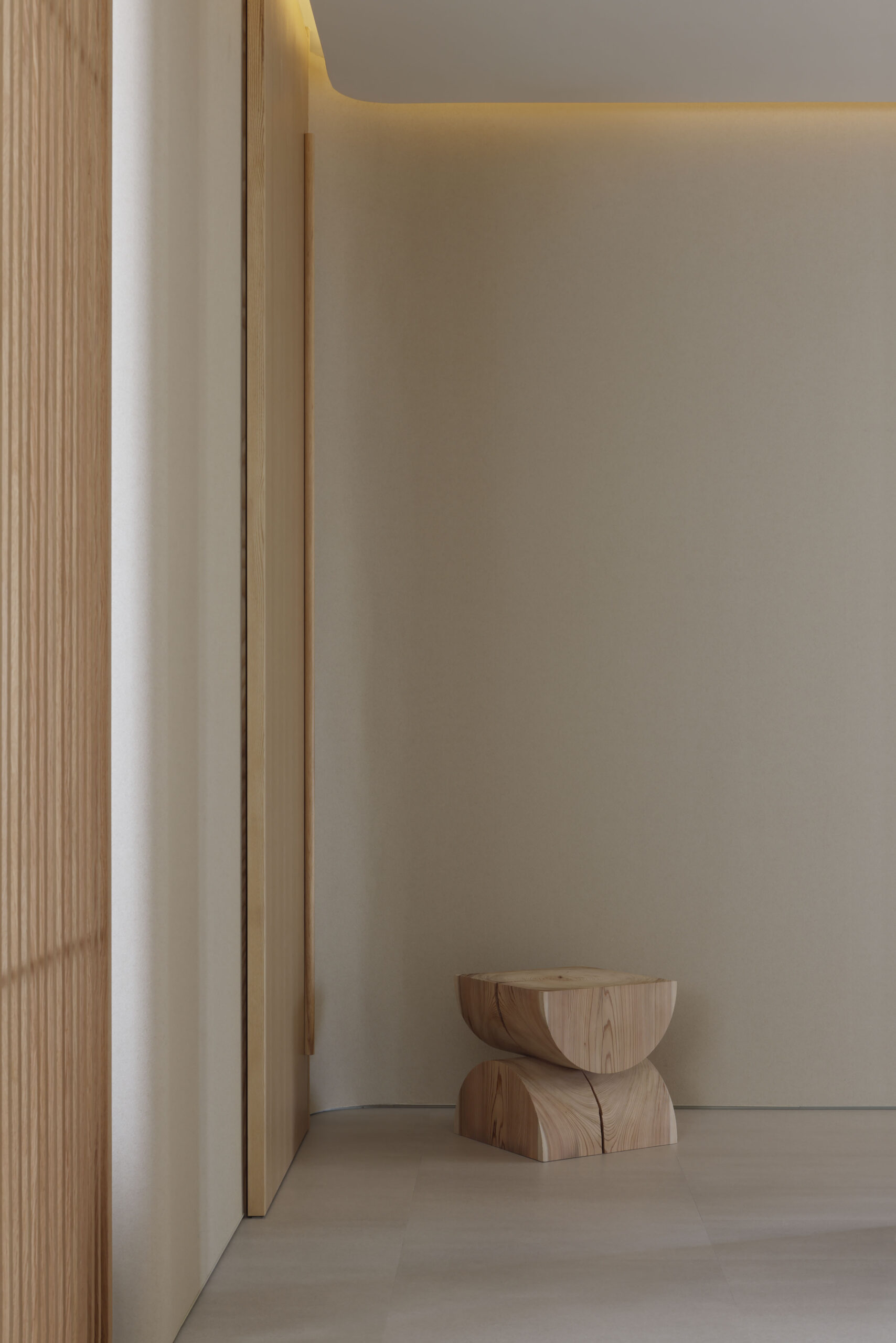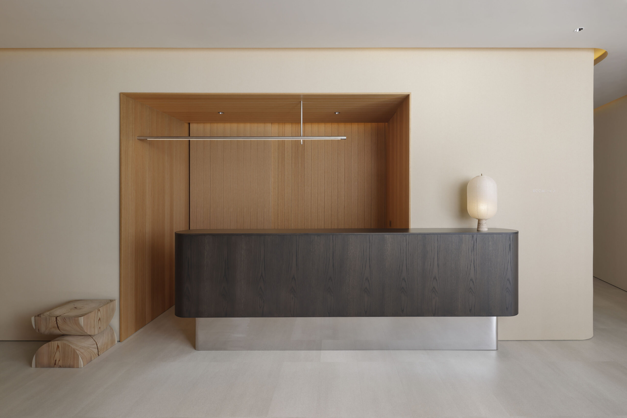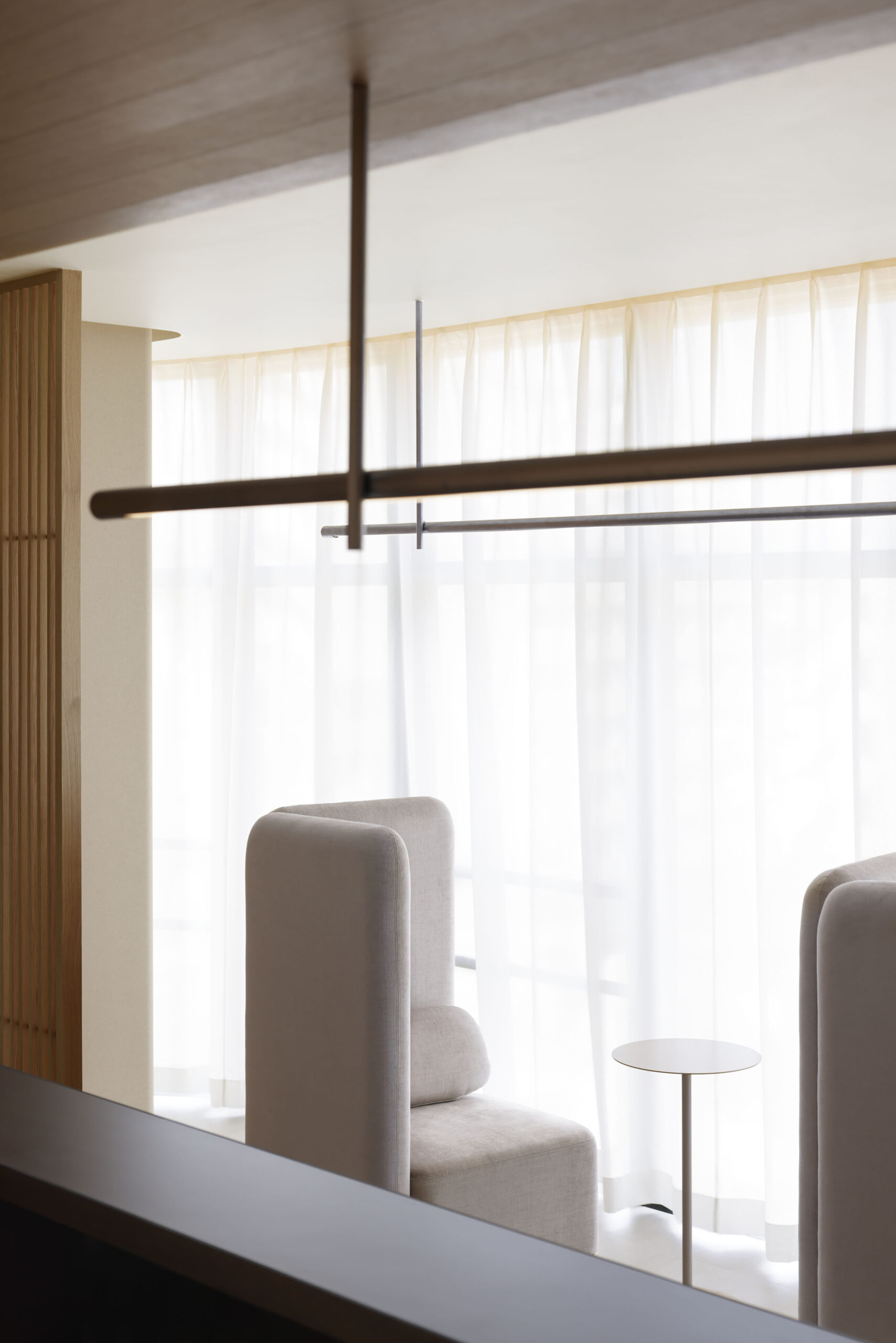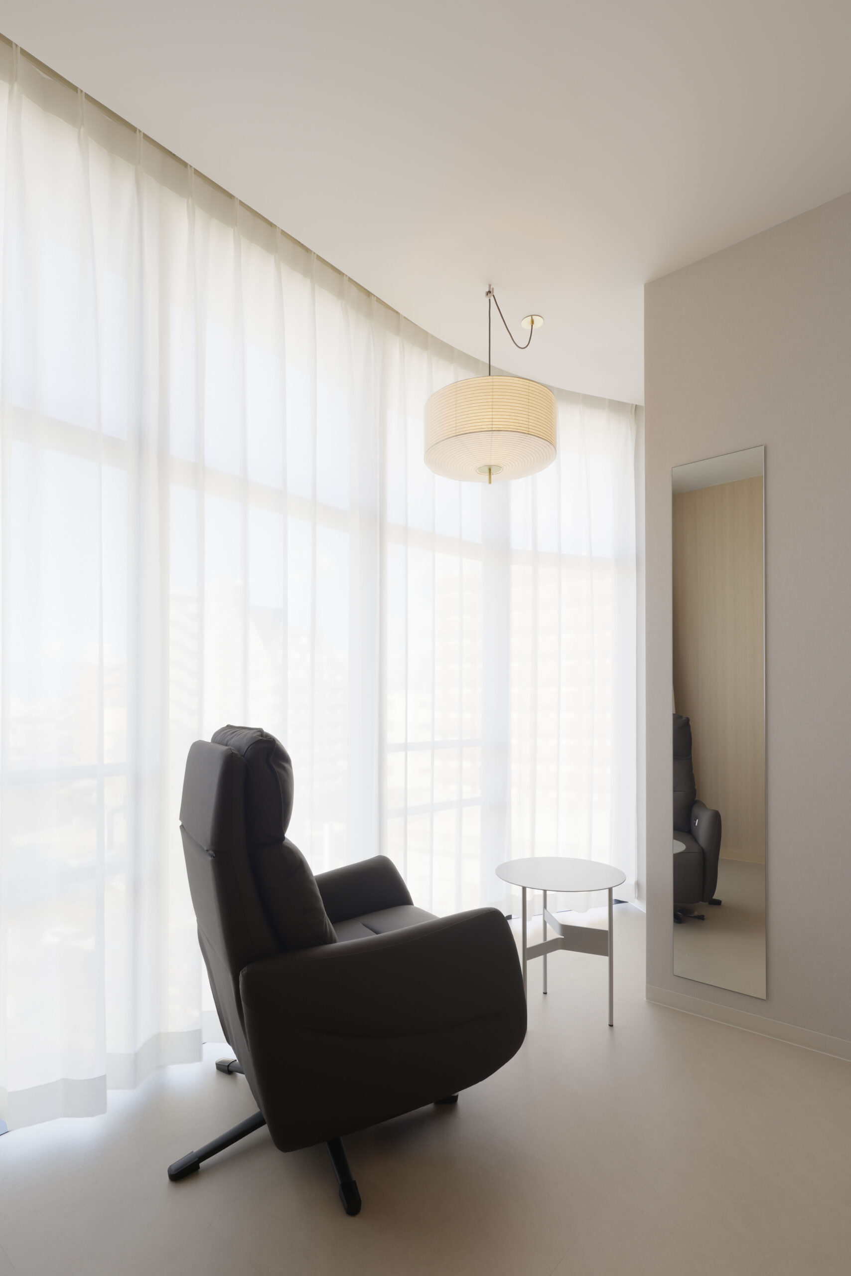3年前に開院された内科内視鏡クリニックの増床PJ。既存クリニックの上層フロアに位置し待合と個室を主としたフロアとなるため医療施設という事を感じさせない特別感のある空間と、今後の更なる増床を見据えたゾーニング計画が求めらた。造作や照明器具・ソファなど各所に丸みを持たせたやわらかな空気感の中に外光が気持ちよく差し込むホテルライクな空間を目指しました。各所に散りばめたオリジナルのPIPE意匠は待合いスペースでは和を感じさせるディティールに照明機能を持たせ、PIPE先端から光がこぼれるルームサイン照明は内視鏡からイメージしシンプルでやわらかな空間に直線的かつ工業的な素材感を落とし込むことでほど良い緊張感を加えています。また来院される方々に末長く健康に過ごしてもらえる様にと思いを込めて樹齢100年を越える杉の無垢材から削り出された北田氏の作品を空間に添えています。