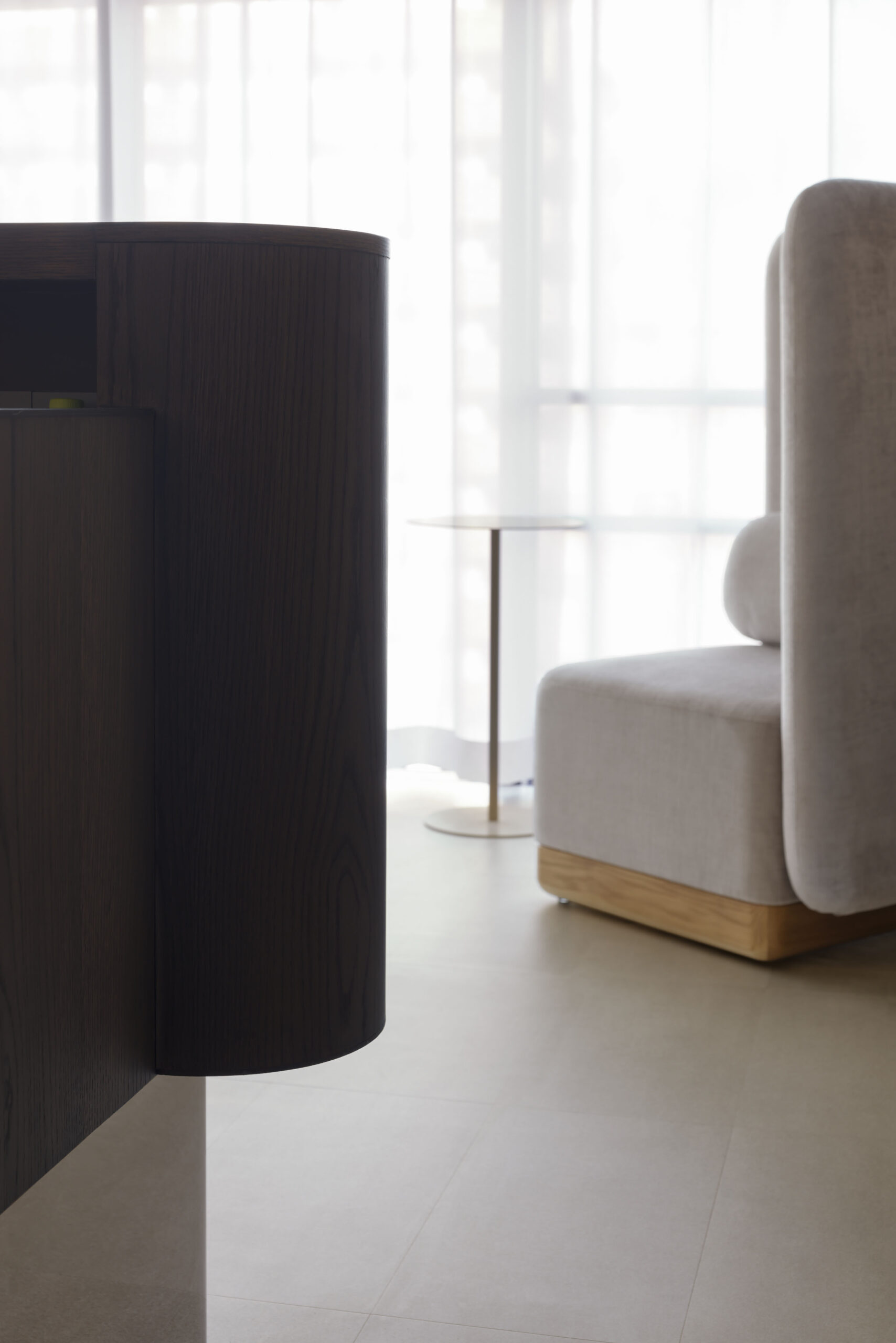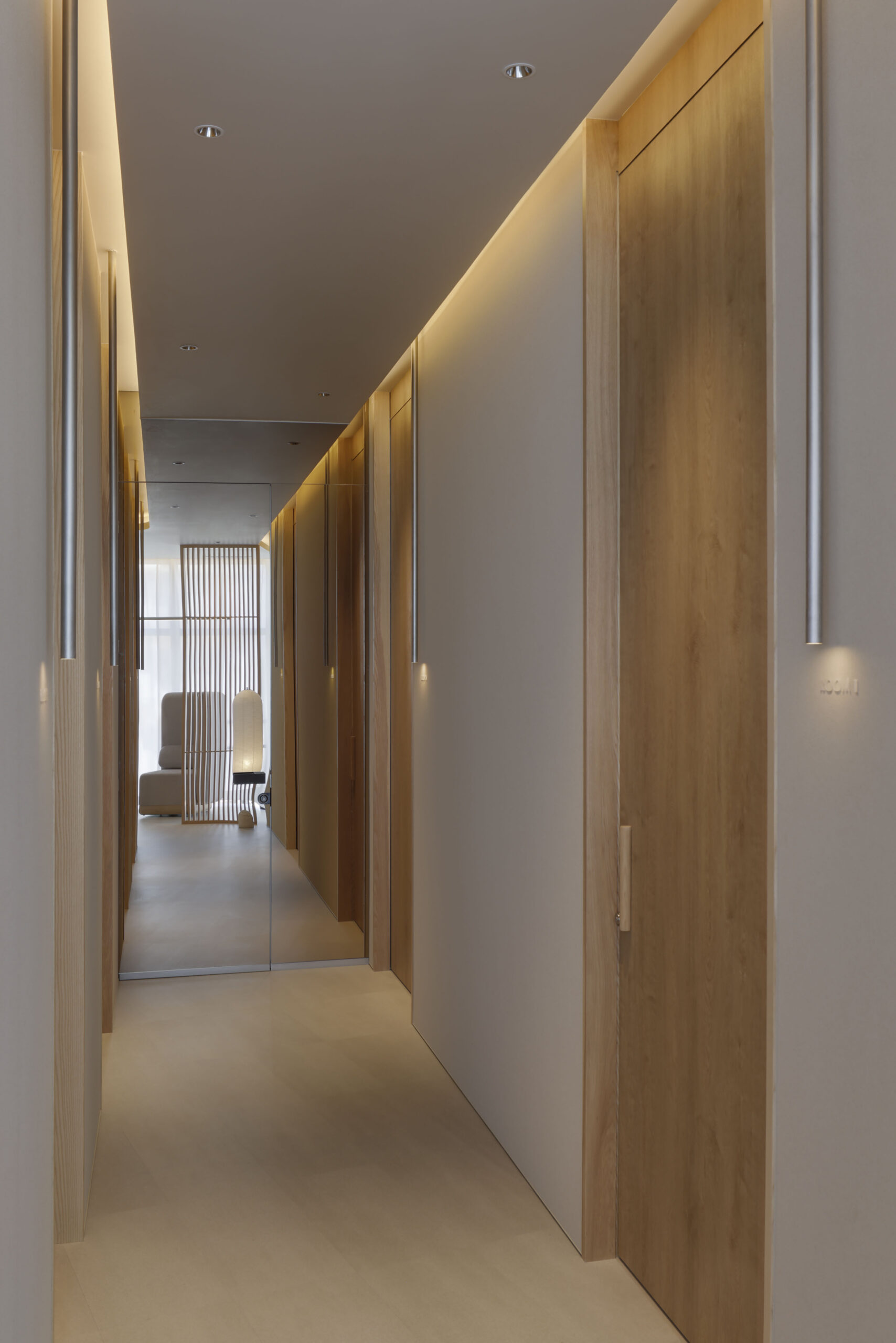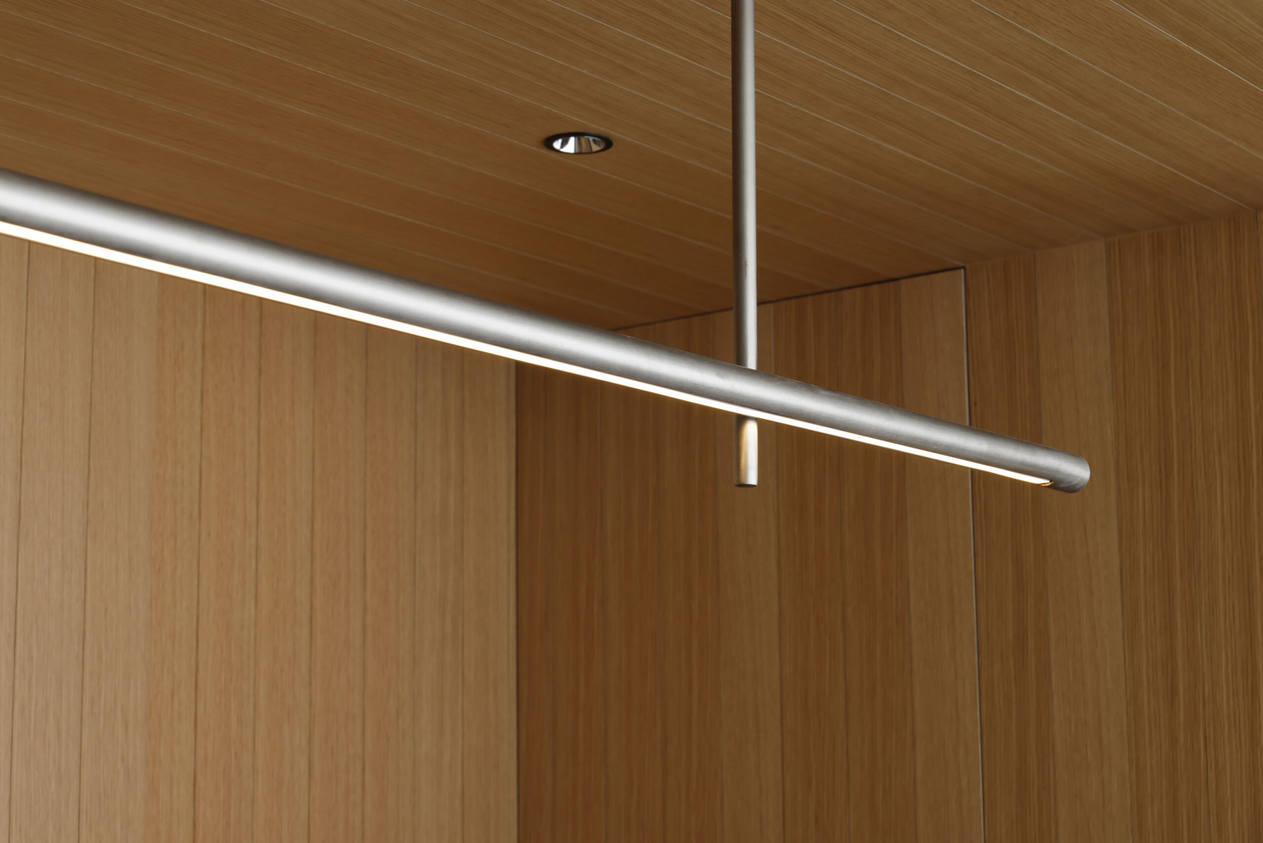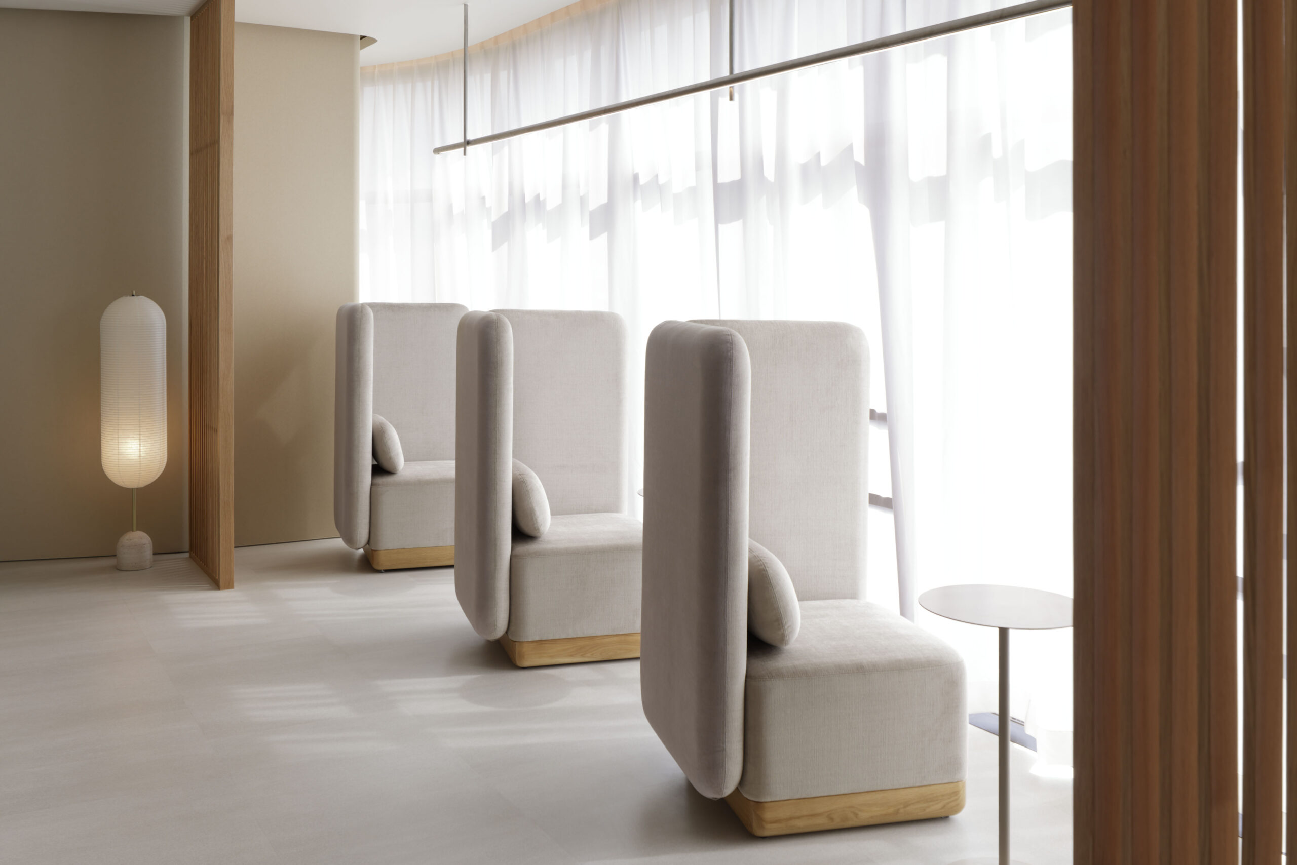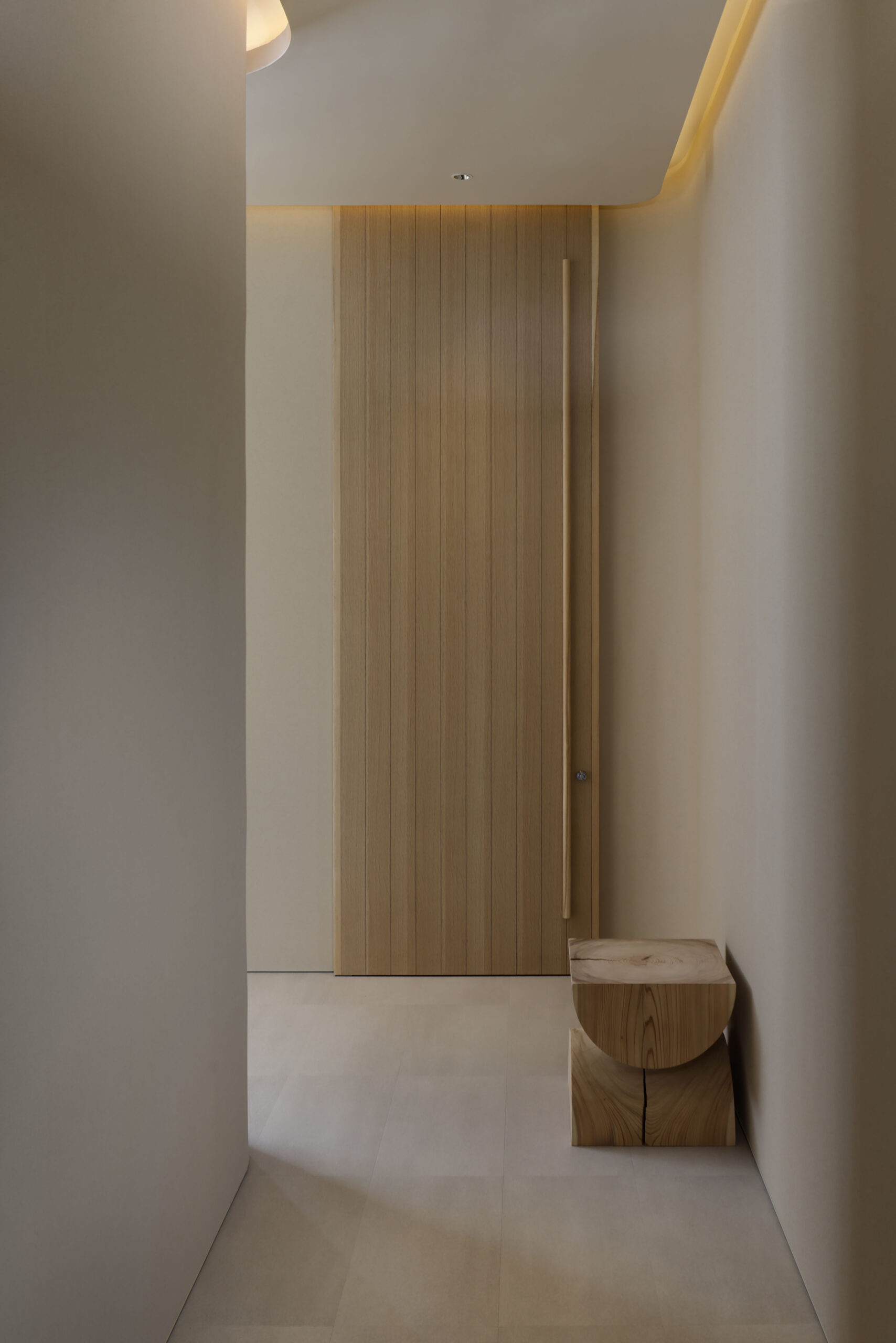 3年前に開院された内科内視鏡クリニックの増床PJ。既存クリニックの上層フロアに位置し待合と個室を主としたフロアとなるため医療施設という事を感じさせない特別感のある空間と、今後の更なる増床を見据えたゾーニング計画が求めらた。造作や照明器具・ソファなど各所に丸みを持たせたやわらかな空気感の中に外光が気持ちよく差し込むホテルライクな空間を目指しました。各所に散りばめたオリジナルのPIPE意匠は待合いスペースでは和を感じさせるディティールに照明機能を持たせ、PIPE先端から光がこぼれるルームサイン照明は内視鏡からイメージしシンプルでやわらかな空間に直線的かつ工業的な素材感を落とし込むことでほど良い緊張感を加えています。また来院される方々に末長く健康に過ごしてもらえる様にと思いを込めて樹齢100年を越える杉の無垢材から削り出された北田氏の作品を空間に添えています。